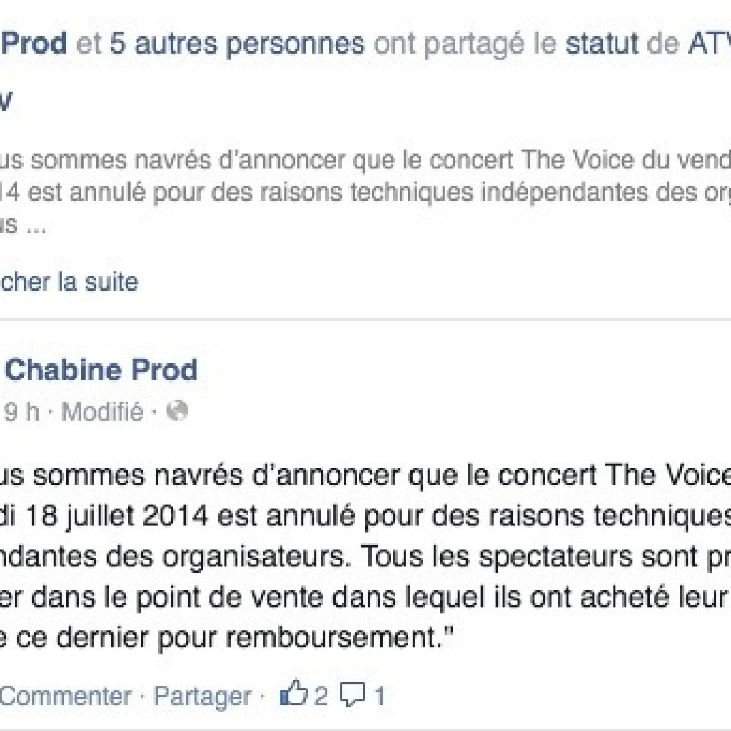 « Nous sommes navrés d’annoncer que le concert The Voice du vendredi 18 juillet 2014 est annulé pour des raisons techniques indépendantes des organisateurs. Tous les spectateurs sont priés de retourner dans le point de vente dans lequel ils ont acheté leur billet muni de ce dernier pour remboursement. »