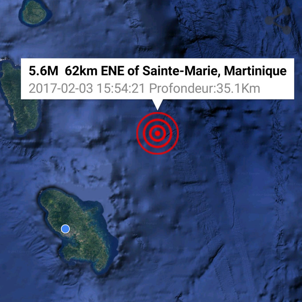 Ce jour, 15:54 la terre tremble en #Martinique. La secousse a été ressentie à la Dominique et jusqu’en #Guadeloupe.