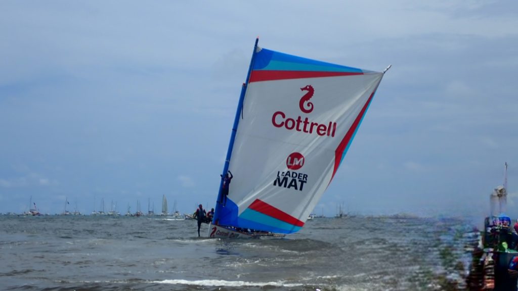 Devant Loic Mas poursuivait son cavalier seul quand deux fait de course ont failli lui être fatal. D’abord la yole s’encaillait sur un sec l’obligeant à une manœuvre et un double virement de bord. Derrière, Félix levait un peu sa main pour éviter l’écueil et se rapprochait. Ensuite, une bascule de vent au moment du dépassement de voile le rendit inutile. Là encore, le poursuivant en profita et se rapprocha encore.