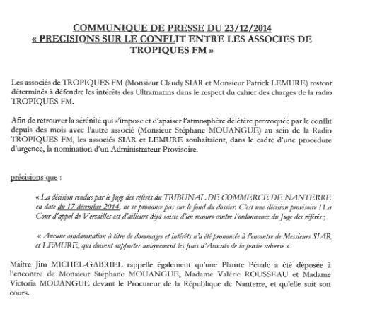 Le 17 décembre dernier , le tribunal de commerce de #Paris ne nous a pas suivis dans notre demande légitime de nomination d’un administrateur provisoire à la tête de #TropiquesFM.