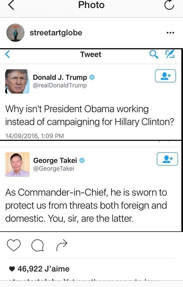 Réponse de George Takei (l’acteur) : « En tant que commandant en chef, il doit nous protéger des menaces venant de l’étranger et de l’intérieur. Vous faites partie de la deuxième catégorie. »