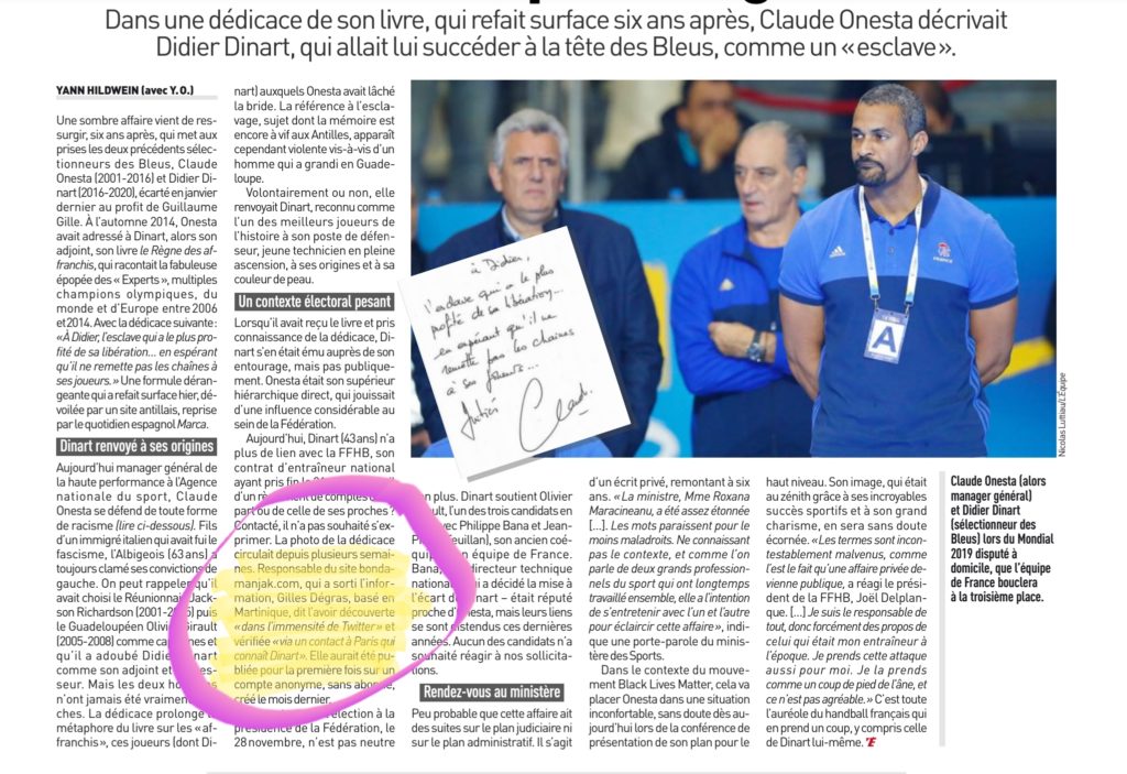 C’est le journal parisien de sports L’Equipe qui le dit. Sous le titre « Des écrits qui dérangent » le journal révèle : « Une formule dérangeante qui a refait surface hier, dévoilée par un site antillais, reprise par le quotidien espagnol Marca »… Et poursuit : « Responsable du site bondamanjak.com, qui a sorti l’information, Gilles Dégras, basé en Martinique, dit l’avoir découverte « dans l’immensité de Twitter » et vérifiée « via un contact à Paris qui connait Dinart ».