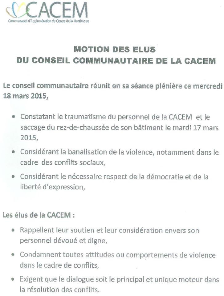 Mécontent d’avoir été ainsi interpellé par des travailleurs cherchant à sortir d’un conflit, le président de la CACEM, Athanase JEANNE-ROSE, a choisi de faire voter une motion par le Conseil Communautaire, réuni le mercredi 18 mars.