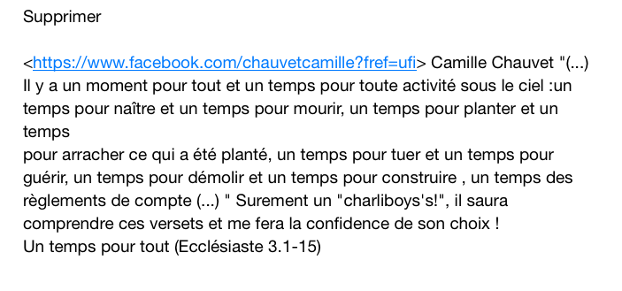 Il y a un moment pour tout et un temps pour toute activité sous le ciel :un temps pour naître et un temps pour mourir, un temps pour planter et un temps pour arracher ce qui a été planté, un temps pour tuer et un temps pour guérir, un temps pour démolir et un temps pour construire , un temps des règlements de compte (…) » Surement un « charliboys’s! », il saura