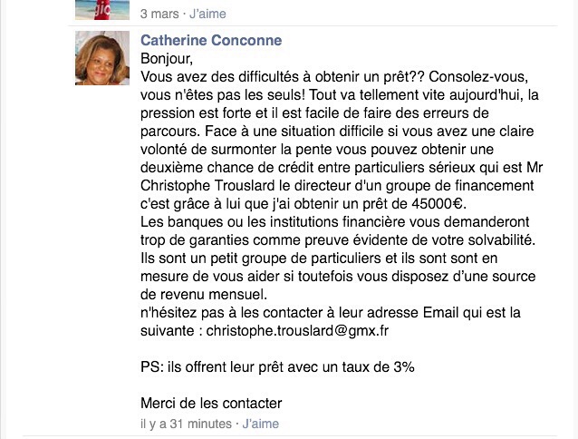 Ce jour, sur la page #Facebook du blog privé #Bondamanjak on a pu noter ce commentaire. Nous avons reconnu facilement…Catherine #Conconne la première vice-présidente du Conseil régional de la #Martinique. Elle aurait obtenu un prêt de 45000 euros. C’est une bonne nouvelle. Nous sommes heureux pour elle. Espérons qu’elle en fera bon usage.