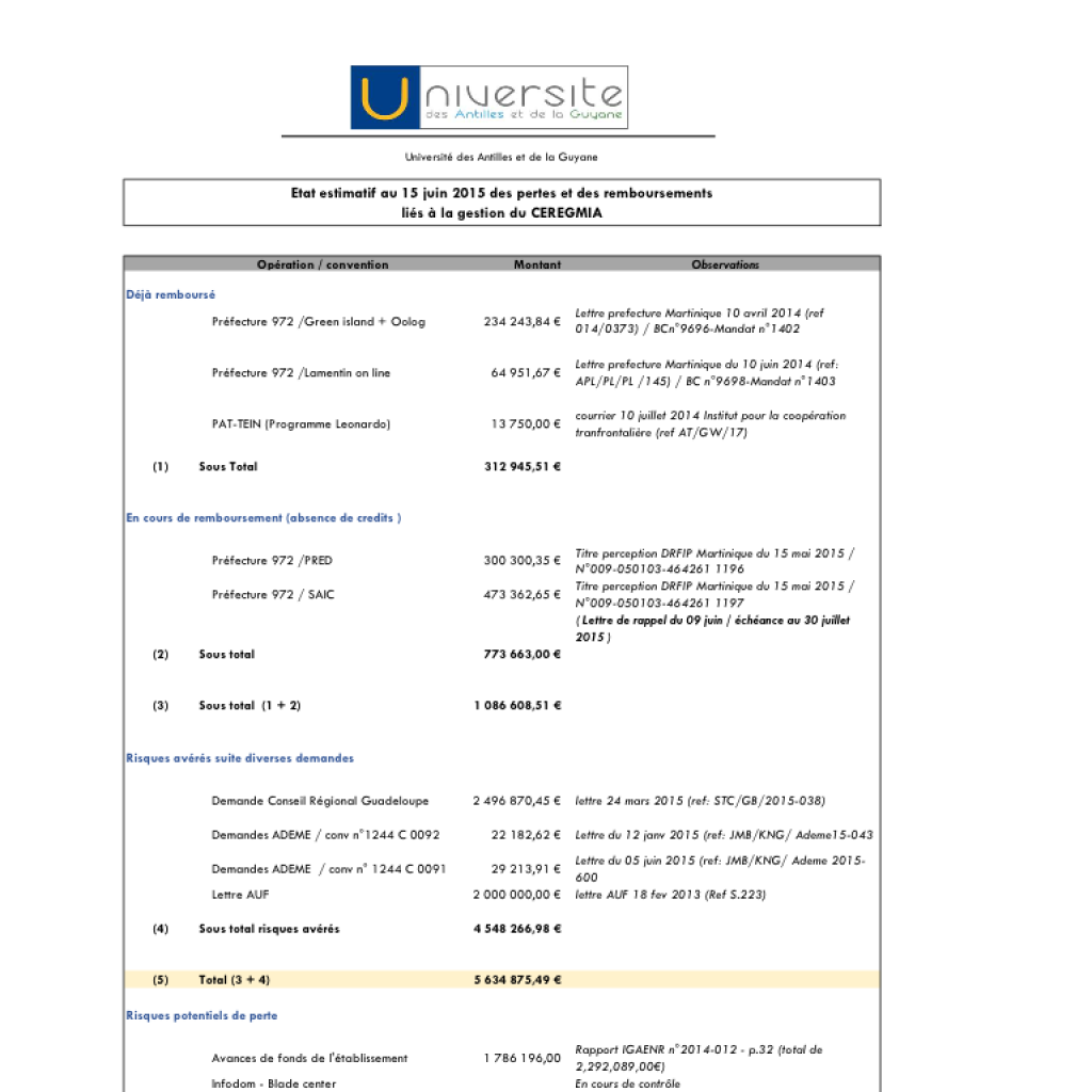 Il n’y a pas d’affaire #Ceregmia en #Martinique en #Guadeloupe et ailleurs. Néanmoins, voilà un bavard tableau récapitulatif des remboursements qui ont été réclamés à l’Université des Antilles (#UA) ex Université des Antilles et de la Guyane (#UAG) . Eh oui…le compte est bon surtout quand les chiffres aidaient l’être.