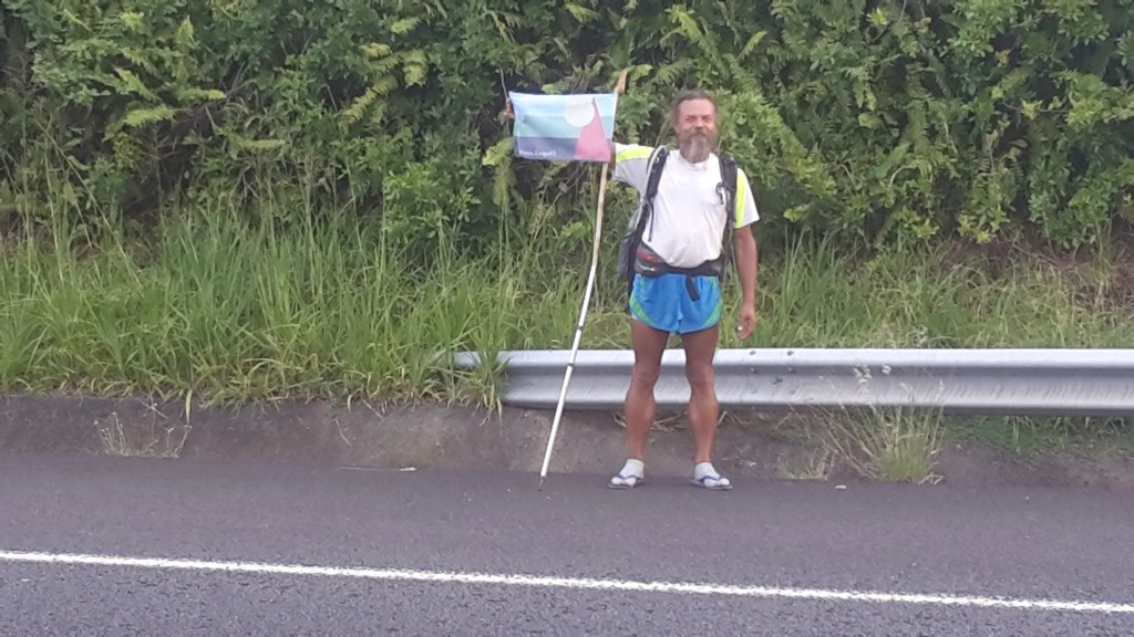 L’homme est en savates avec des chaussettes alors qu’il fait encore chaud. Il plante son drapeau dans le bitume. Et le temps d’un clic reprend son périple.