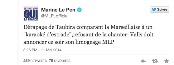 La Ministre de la justice Christiane #Taubira ne chante pas la #Marseillaise le 10 mai lors de la mascarade au Jardin du Luxembourg. et hop ça repart comme en 40. Elle s’explique sur sa page #Facebook…