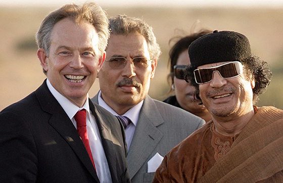 Tony B. (à gauche, Anglais, premier ministre) et Mouammar K. (à droite, dictateur libyen à plein temps, brutalement décédé depuis). C’était le temps des fleurs où Mouamar achetait des milliards d’armement à sa Gracieuse Majestée. Alors forcément, il avait beaucoup de potes, Mouammar…