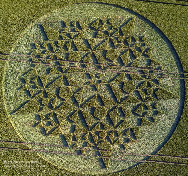 Pour les connaisseurs il s’agit d’un « crop circle », un dessin inexpliqué dans un champ. La taille et la complexité de ces réalisations d’une géométrie parfaite, laisse penser qu’il ne s’agit pas de « fake ». Chaque année en juillet c’est la même chose : des dizaines de ces dessins étranges apparaissent en quelques heures dans les champs d’Angleterre (mais aussi partout dans le monde).