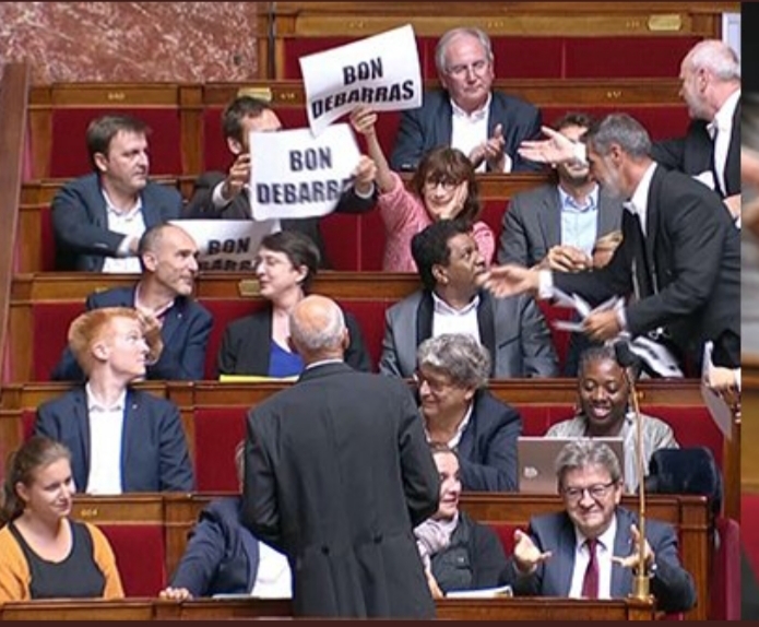 Ce jour, Manuel #Valls candidat à la mairie de Barcelone laissait libre son siège de député français. Les député-es de la France Insoumise ont « salué » son départ à leur manière.Sans commentaire mais comment taire ?