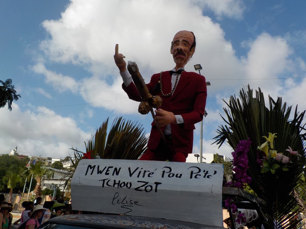 A côté de ce Vaval insignifiant, il faut le dire, il y a un bwabwa qui a captivé les spectateurs et les carnavaliers et qui a dû être photographié des milliers de fois. Précis, direct, tellement dans l’esprit de la tradition de ce qu’un bwava doit être et dans l’ambiance d’un Carnaval populaire et bon enfant. (photo1). « Man viré pou mwen pété tchou zot » signé Lilise.