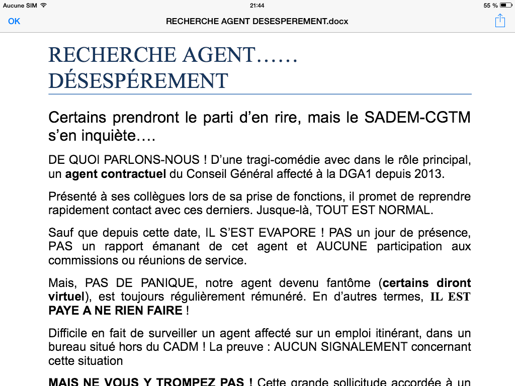 En #Martinique, même au cœur de la démocratie participative, les syndicats ont du mal à se faire entendre. Voilà le contenu d’un tract qui a eu le trac avant de se retrouver sur les devants de la scène médiatique . Cette information date de novembre 2014. Le syndicat SADEM-CGTM s’interroge sur l’assiduité d’un élu qui serait rétribué pour une tâche dont il se détache sans faire tâche.