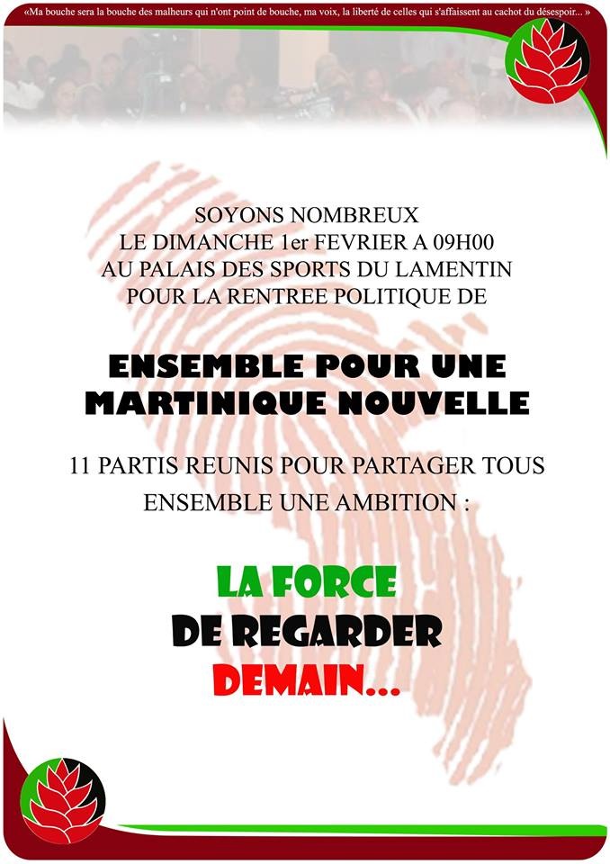 Ce jour, c’est la grande messe de Ensemble Pour une Martinique Nouvelle. Une rentrée politique qui se déroulera ce dimanche 1er février 2015 au Palais des sports du Lamentin dès 9:00.