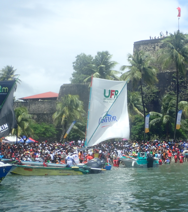 Le vent a stoppé Cottrell/Leader Mat qui dans un bord sud semblait pouvoir porter sa voile et passer en tête à la bouée de Schoelcher puisque dans le même temps dans le grain avec un vent sud toutes les yoles de devant Rosette/L’Appaloosa, UFR/Chanflor, Sara/Auto Distribution, Sapro/Pneus Cash, CTDM/EDF/Fraikin avaient lâché l’écoute du bas et tentaient de rester à flot.