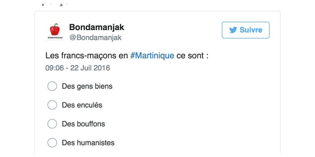 Les francs-maçons en #Martinique ce sont … (sondage) bondamanjak 9 ans ago Les francs-maçons en #Martinique ce sont :