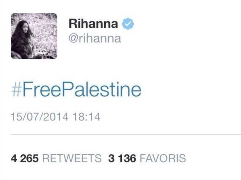 #freepalestine by #rihanna bondamanjak 11 ans ago Le 15 juillet 2014, la chanteuse #Rihanna a balancé sur #Twitter ce #tweet puis ce dernier a …disparu. Abattu par un cyber drone ?