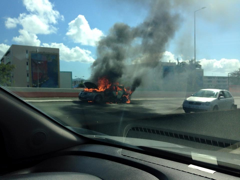 Images du jour (15 février 2015) #martinique bondamanjak 11 ans ago Voiture en feu au début de l’autoroute dans le sens Fort-de-France – Lamentin en #Martinique . Le conducteur a été blessé.