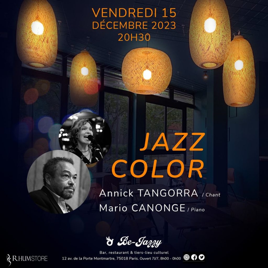 JAZZ COLOR au BE-JAZZY bondamanjak 2 ans ago Vendredi 15/12/2023 : Concert JAZZ COLOR https://www.facebook.com/events/2548882791956830Annick Tangorra, chanteuse à la voix chaleureuse, auteur-compositeur amoureuse de musique brésilienne et afro-caribéenne, sera en duo avec Mario Canonge, un des plus fameux pianistes caribéens au monde. En décembre 2023, son album Mario Canonge Trio est arrivé 5e au palmarès TSF JAZZ !Vendredi 15 décembre, ce duo complice vous emmènera en voyage à travers des mélodies qui oscillent entre une convivialité irrésistible et une parfaite maîtrise de leur art, le tout ancré dans les racines antillaises et des influences du monde entier.Rendez-vous au Be-Jazzy, 12 avenue Porte Montmartre à Paris 18e !Entrée libre, consommation obligatoire sur place #bejazzy#Paris#paris18#concert#jazz#concertjazz#mariocanonge#annicktangorra#ideesortie#sortiraParis#afterwork#fridaynight#weekend#vendredi15decembre2023#15decembre2023