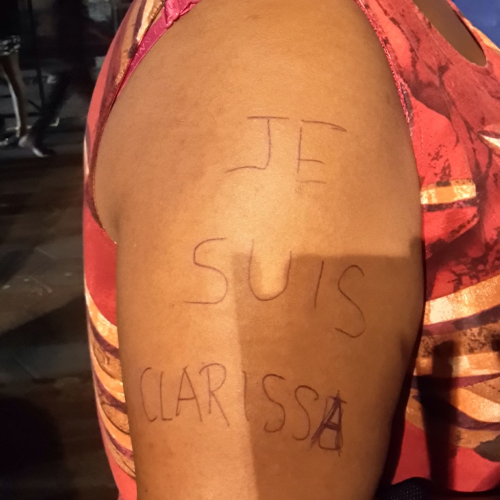 Seule une femme a écrit au feutre sur son bras droit …je suis Clarisse…après correction…elle rectifie… »j’ai entendu Clarisse » … »Non..c’est Clarissa…Clarissa Jean-Philippe …elle est de Sainte-Marie ». Sur son bras gauche, on peut lire …Je suis Charlie.