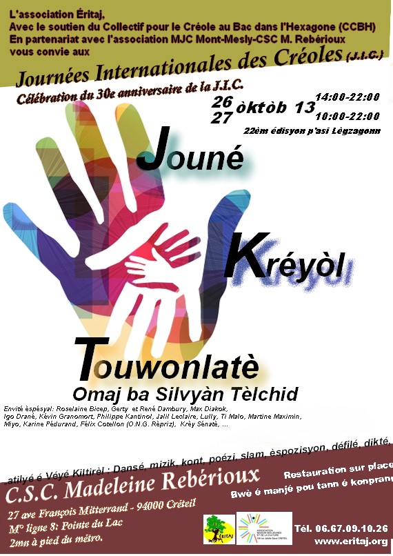 En région parisienne, les « Journées internationales des créoles » se dérouleront les 26 et 27 octobre 2013 au Centre socioculturel M. Reberioux, 27 avenue François Mitterrand (Metro Ligne 8 Créteil – Pointe du Lac).