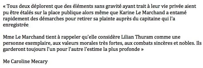 Karine le #Marchand blanchit #Thuram bondamanjak 12 ans ago Bonne nouvelle. Un peu plus de 24 heures après l’annonce publique d’un dépôt de plainte à l’encontre de Lilian #Thuram, Karine le #Marchand signifie clairement que cette plainte a été retiré. Ouf. le bonheur est de nouveau dans le pré.