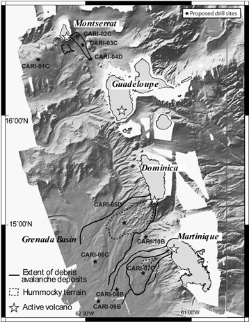 Grâce aux analyses des carottes marines prélevées en 2002 au large des Petites Antilles, les scientifiques ont mis en évidence un nombre d’éruptions plus important que celui déduit des seules études effectuées sur la terre ferme (où les dépôts des éruptions sont parfois masqués ou érodés). En plus des sédiments et des niveaux de cendres volcaniques qui permettront d’accéder à l’histoire des volcans, les forages prélèveront, pour la première fois, les dépôts d’avalanches de débris, dans une zone où la fréquence des déstabilisations semble plus importante qu’ailleurs.
