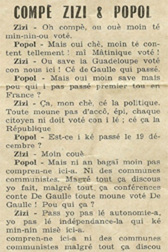 Fête des pères 2009. je rends visite à mes parents. Ma mère me montre une de ses trouvailles. Un exemplaire de l’hebdomadaire « Aujourd’hui Dimanche édité par l’église catholique en #Martinique. Le document date du 12 décembre 1965. J’avais 11 mois et 10 jours…je parcours ce quatre pages et je découvre un article étonnant « Compè Zizi & Popol…le texte use d’un créole approximatif pour mieux capter les fidèles. L’autonomie, l’indépendance et les communistes sont les démons. La misère et la peur pire sont les ambassadeurs de la démarche. Il faut le lire pour le croire, le rôle de l’église catholique est sans ambages. 44 ans plus tard, le discours de Nicolas #Sarkozy prononcé le 26 juin 2009 à l’aéroport Aimé #Césaire peut permettre de démasquer cette imposture pathétique qui plante son dard dans l’âme des fidèles.