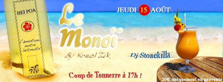 Chapeaux, lunettes, paréos,chemisettes, maillots, bermudas, claquettes, les pieds dans l’eau!!!! Viens vivre ton 15 août avec kréolzik dans un cadre exceptionnel sur la route des plages sous les vibes de Stonkilla! C’est « Le Monoi » de 14h00 à 02h00. De nombreuses surprises vous attendent dès 14h00. 1 coup de tonnerre est prévu à 17h00. Entrée uniquement en prévente – tarifs 20€ (les dernières @ 25) Contact 0696930455.@ bientot William.BERISSON.