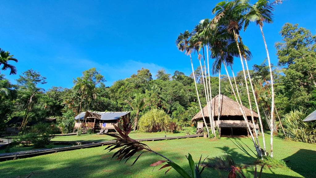 Le camp Cisame se mérite. Sur place, le dépaysement est absolu. En haut de l’escalier en bois, sur un plateau gazonné, des carbets où sont accrochés les hamacs pour la nuit apparaissent à travers la fine pluie d’accueil, vite dispersée. L’air est pur, lumineux, le soleil donne un éclat particulier aux arbres qui entourent le site.