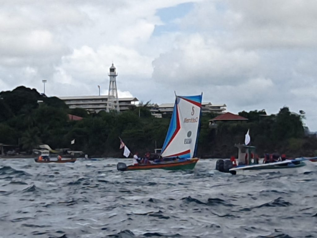 Spica de Diany Remi (Sara Energies Nouvelles-Autodistribution) en profitait pour prendre le large suivie Lanbéli (Prixe-Westpoint) intenable de Le Dernier Jugement patronnée par Loic Mas (Cottrell/Leader Mat) et de L’arme Fatale (Ets Rosette/L’Appaloosa). Ces yoles passaient la porte de Cap Nord à Case-Pilote dans cet ordre … et puis la course changeait car le vent à partir de là, était établi et permettait aux équipages de donner leur pleine mesure en navigation et pas à la godille et à la bassine. Spica semblait s’envoler vers la victoire, à terre les supporters marinois étaient déchainés, à la radio certains animateurs et mêmes des prétendus spécialistes continuaient à dévider leur lot d’inepties et d’approximations (vraiment, il y en a quelques-uns on se demande pourquoi ils sont encore là. Mais glissons).