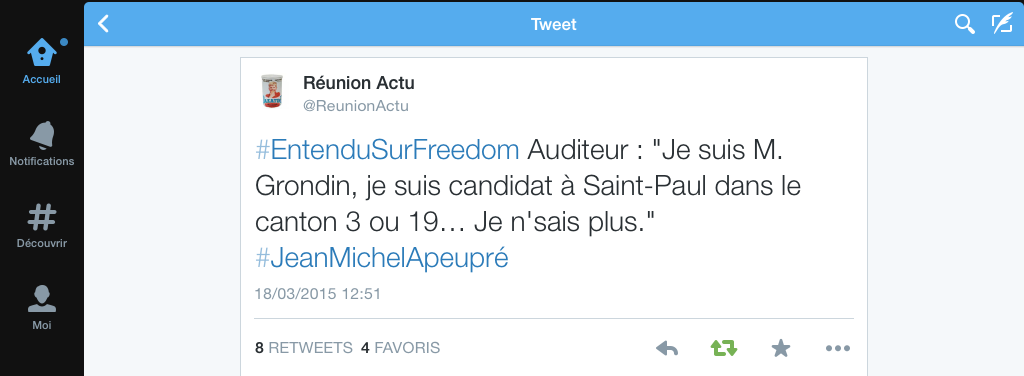 Le tweet du jour (18/03/15) #departementales2015 #lareunion bondamanjak 11 ans ago Des candidats avec de telles convictions politiques ça fait peur… #departementales2015 #lareunion #radiofreedom #reunionisland #iledelareunion #cantonnales2015