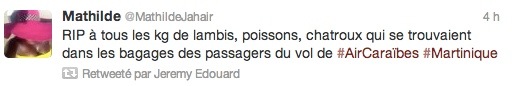 Le tweet du jour … bondamanjak 12 ans ago Le tweet du jour…on le doit à Mathilde une passagère pleine d’humour qui se trouvait à bord du vol TX 511 d’Air Caraïbes au départ de la #Martinique. Comme quoi les fruits de mer peuvent être le fruit de passion.