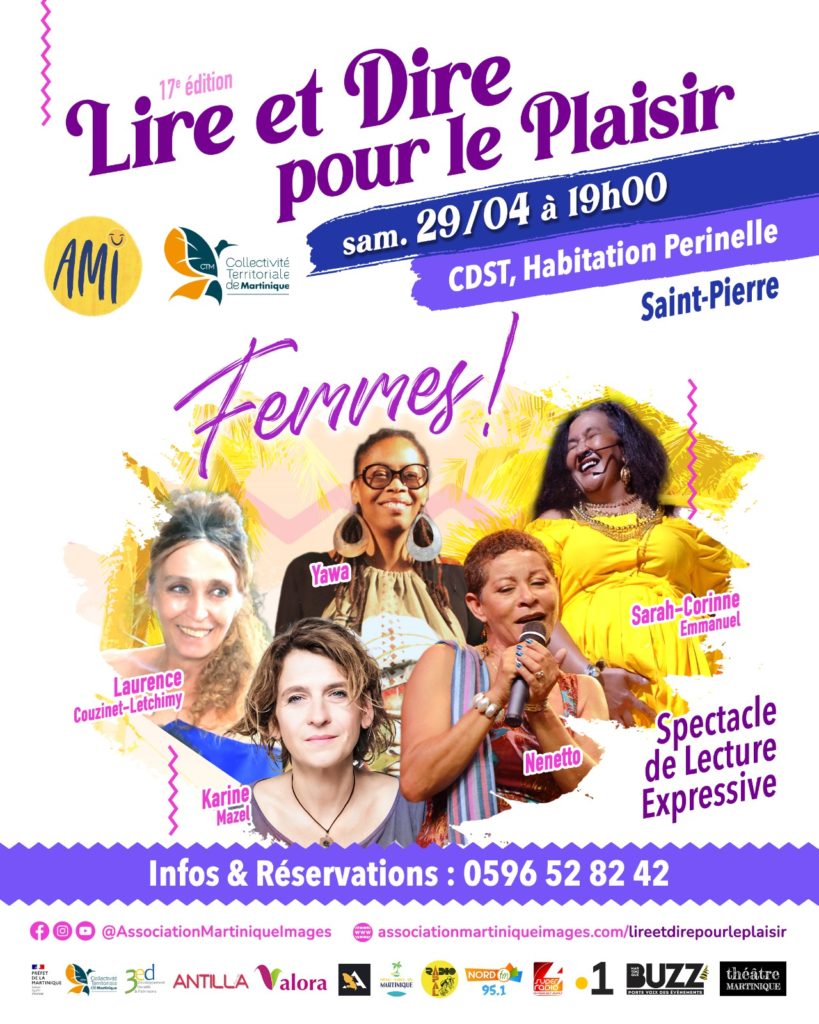 AMI, l’Association Martinique Image propose un spectacle de Lecture Expressive pour mettre à l’honneur les Femmes. Ces cinq artistes : Laurence Couzinet-Letchimy, Sarah-Corinne Emmanuel, Karine Mazel, Nenetto et Yawa seront au CDST, Centre de Découverte des Sciences de la Terre de Saint-Pierre ce samedi 29 avril à 19 heures.