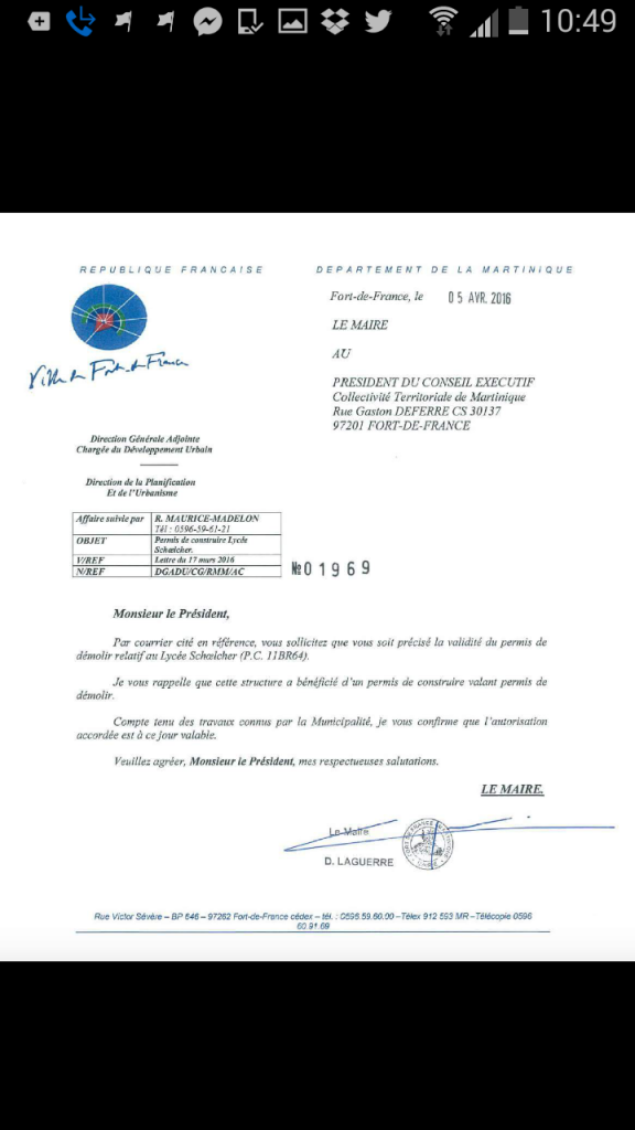L’intention de tous les nostalgiques dont certains qui n’ont pas passé, comme moi, huit années sur les bancs de l’actuel « Lycée Schoelcher » (d’abord comme élève puis comme professeur), je publie la preuve que le Maire de Fort-de-France en #Martinique a déjà donné le « permis de démolir et de reconstruire » les bâtiments de ce lycée vieux de plus de 80 ans !