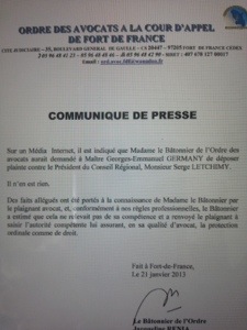 Mes chères lectrices et lecteurs, je vous prie de trouver ci-joint, le communiqué alambiqué par lequel, le bâtonnier rectifie en disant qu’elle a invité Maître Germany à déposer plainte contre Serge Letchimy en l’assurant de sa protection. Si « demander » n’est pas « inviter », Bondamanjak lui demande , l’invité ou la renvoie à visionner les témoignages de Bertrand Cambusy et Marie Adémar et lui pose la question : » Madame le bâtonnier, pourquoi un tel silence suite à l’agression ? N’avez vous pas vu ces vidéos sur YouTube ?
