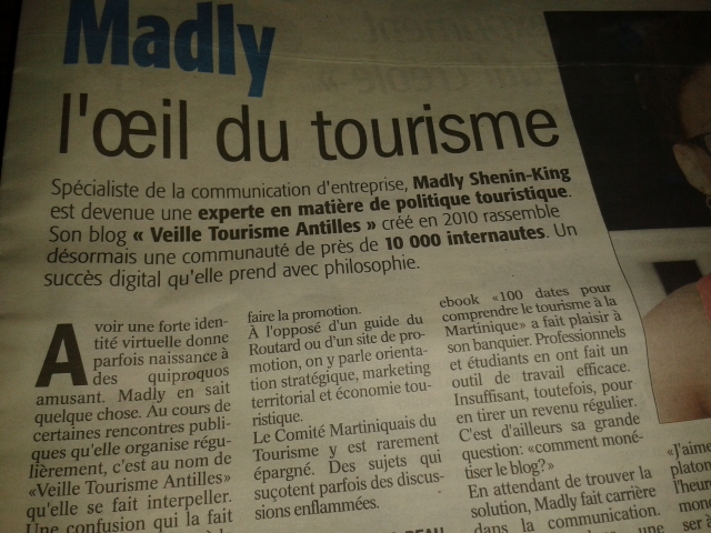 (#France-Antilles, édition #Martinique du mercredi 23 avril 2014, page 9, article « Madly l’œil du tourisme »).