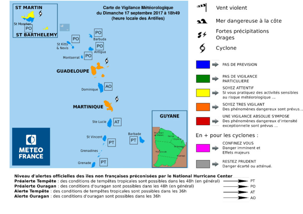 La Guadeloupe et la Martinique sont en « alerte orange cyclone ». Houle, vent violent sous les rafales, pluies diluviennes, crues, …… On s’attend à une sérieuse dégradation des conditions météorologiques dans la nuit.
