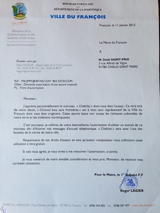 En #Martinique, on « aime » les musiciens. Le sénateur maire Maurice #Antiste, celui qui a allègrement surfé sur et dans le tube de la vague de l’affaire Thierry #Dol sait flatter notamment les franciscains pour arriver à ses fines fins. Le cas de Dédé Saint-Prix est significatif. Il aime la chanson mais il aime aussi la gratuité. Cet homme qui ne respecte pas l’œuvre d’autrui… souhaite également le pire à son prochain puisque Mowis rappelez vous avait prédit que mon quart d’heure arriverait (en créole dans le texte …kar dè’y ké rivé).