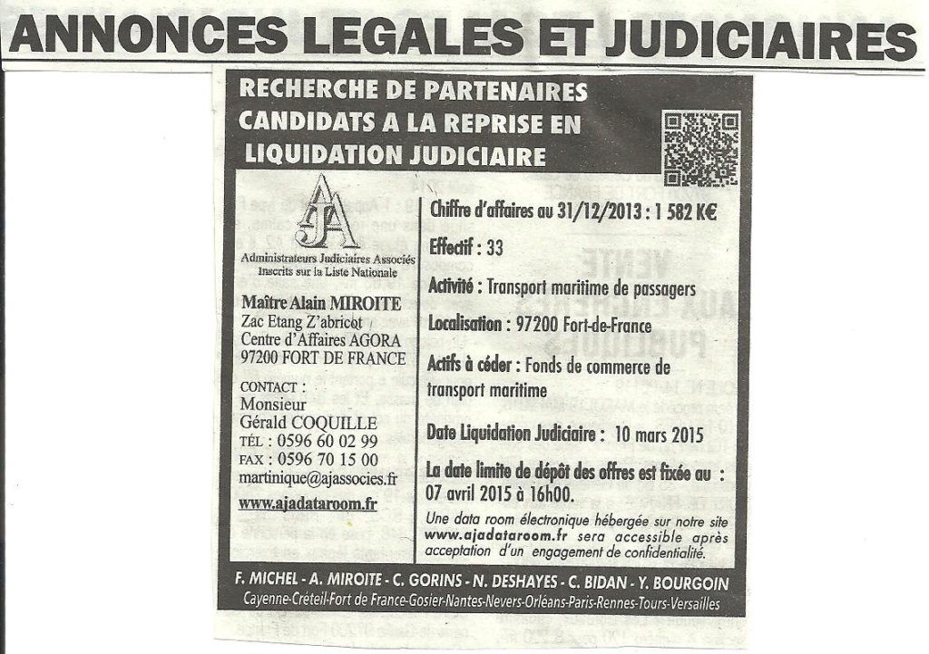 « Mon gérant n’a pas assuré » bondamanjak 11 ans ago Voilà une annonce de recherche de partenaires candidats à la reprise en liquidation judiciaire publiée dans le #France-Antilles édition #Martinique du 24 mars 2015. Ça sent fort la société qui a été mené en bateau. A suivre.