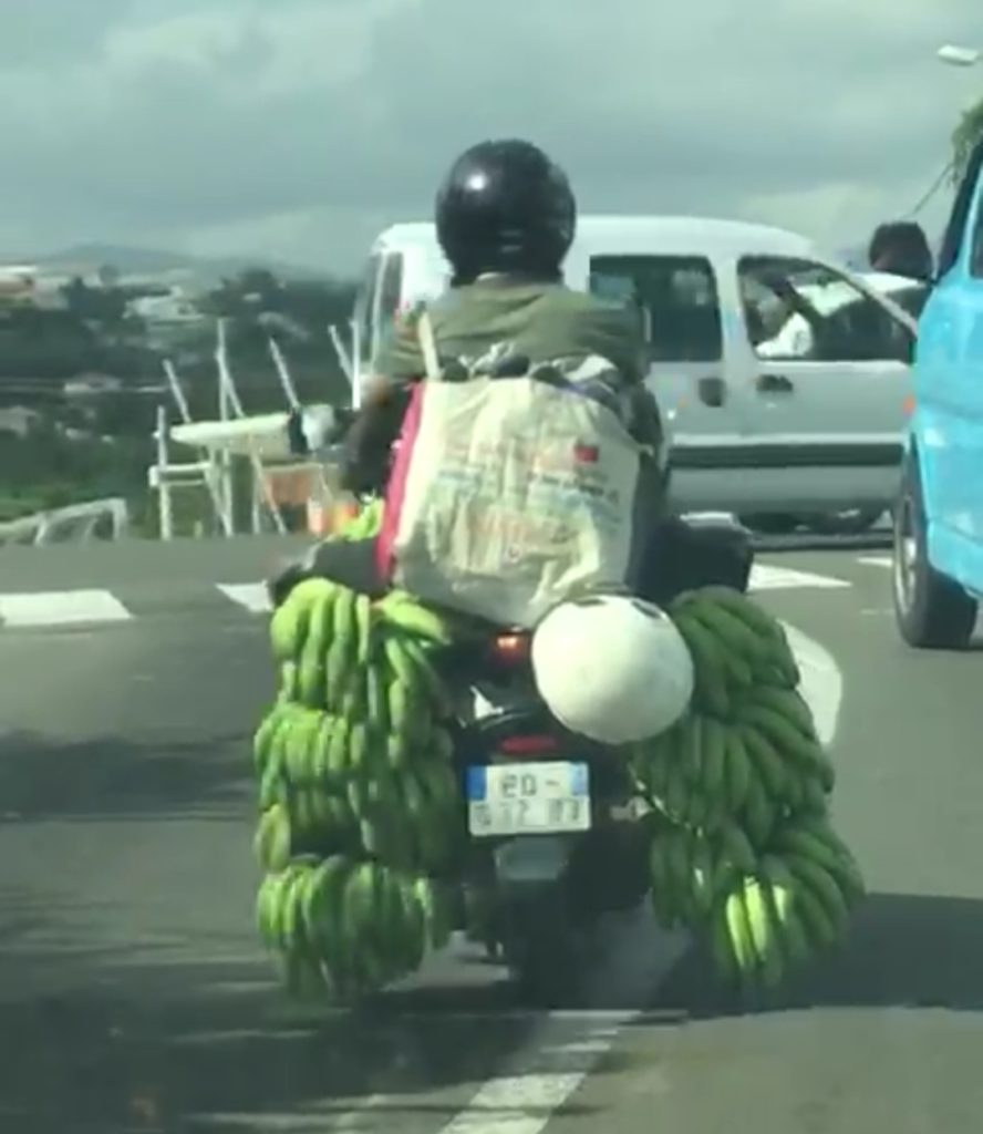 Mi BAB. Un motard invente la #Banane Air Bag (BAB) en #Martinique. Un casque, un régime de bananes de chaque côté et plus aucune raison que le corps déconne. Eh oui on n’arrête pas pas le progrès. Glee for that?