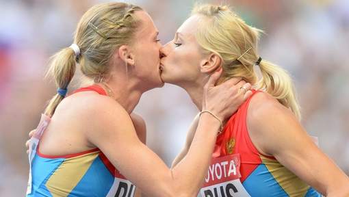Le truc fait un buzz mondial. et pourtant, comme le montre la photo, les deux athlètes russes, Ioulia Gushchina et Kseniya Ryzhovane, ne s’embrassent pas à pleine bouche, elles ne s’embrassent même pas sur les lèvres.