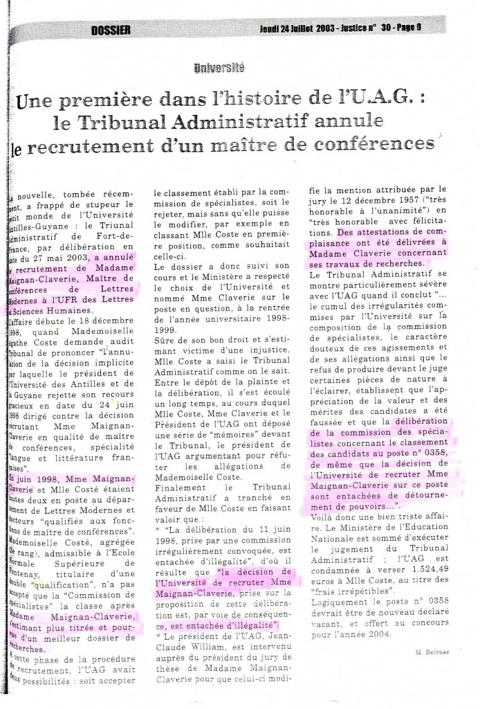 Nom d’une algue sargasse. Voilà un article du journal #Justice publié en #Martinique qui date du 24 juillet 2003. 12 ans d’âge…comme un bon vieux rhum vieux. By low law. Ça concerne Chantal #Maignan. Au cœur de la démocratie participative, sa lecture nous a laissé sans voix et sans voie. Que Dieu, Djee Zeus, Monseigneur David #Macaire et le révérend Jesse Jackson nous pardonnent. Sans commentaire mais comment taire ?