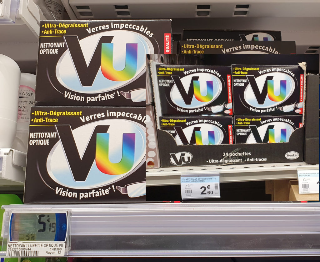 Sur la photo 1, ci-après, une boite de lingettes nettoyantes pour lunettes dans un Carrefour à Paris, il y a un mois environ.