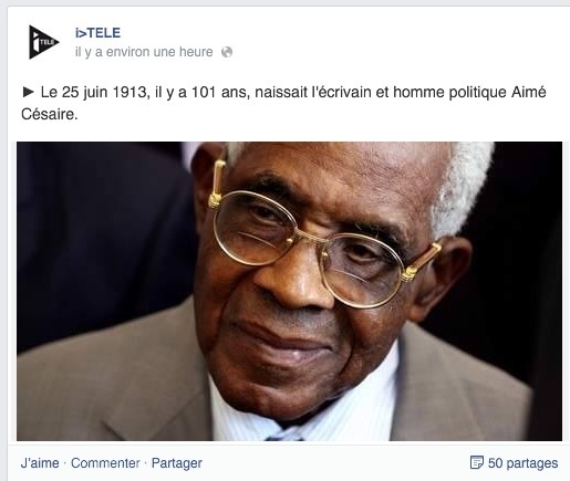 La chaîne française I>Télé souhaitait faire dans la négritude mais elle s’est retrouvée dans le noir absolu en voulant célébrer la date de naissance de Aimé #Césaire. Une plantage de 24 heures puisque le poète a vu le jour le 26 juin 1913. Encore une gouvernance qui manque sérieusement d’ingénierie. Lol.