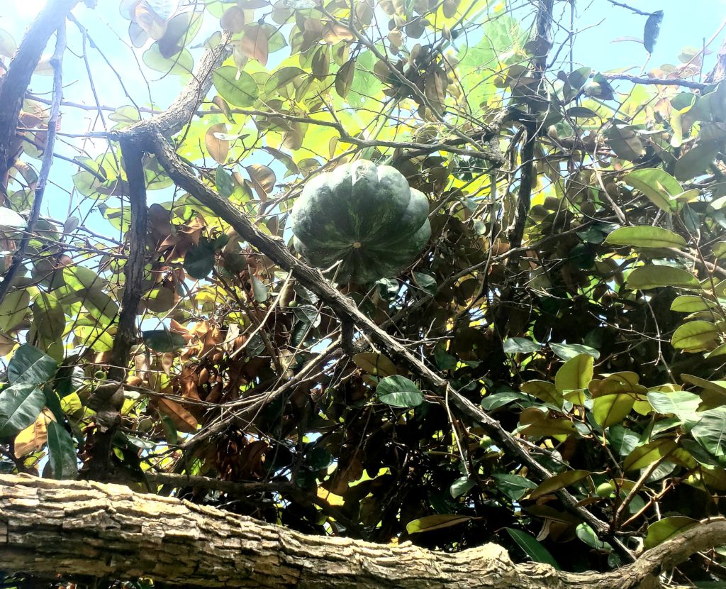 Contrairement à cet élu foyalais, ce pied de giraumon (Cucurbita maxima) ne fait pas de vaines et durables promesses. Eh oui, cette variété de potiron a choisi de grimper sur un caïmitier pour fructifier. Vivement la récolte.