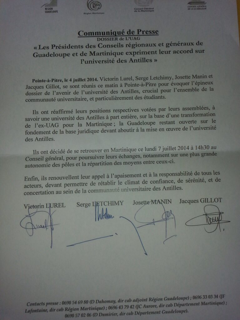 Quatre signatures et une #Université bondamanjak 11 ans ago Ils ont signé. Les présidents des Conseils régionaux et généraux de #Martinique et de #Guadeloupe sont quasiment en phase pour la mise en place de l’#Université des #Antilles. A suivre.