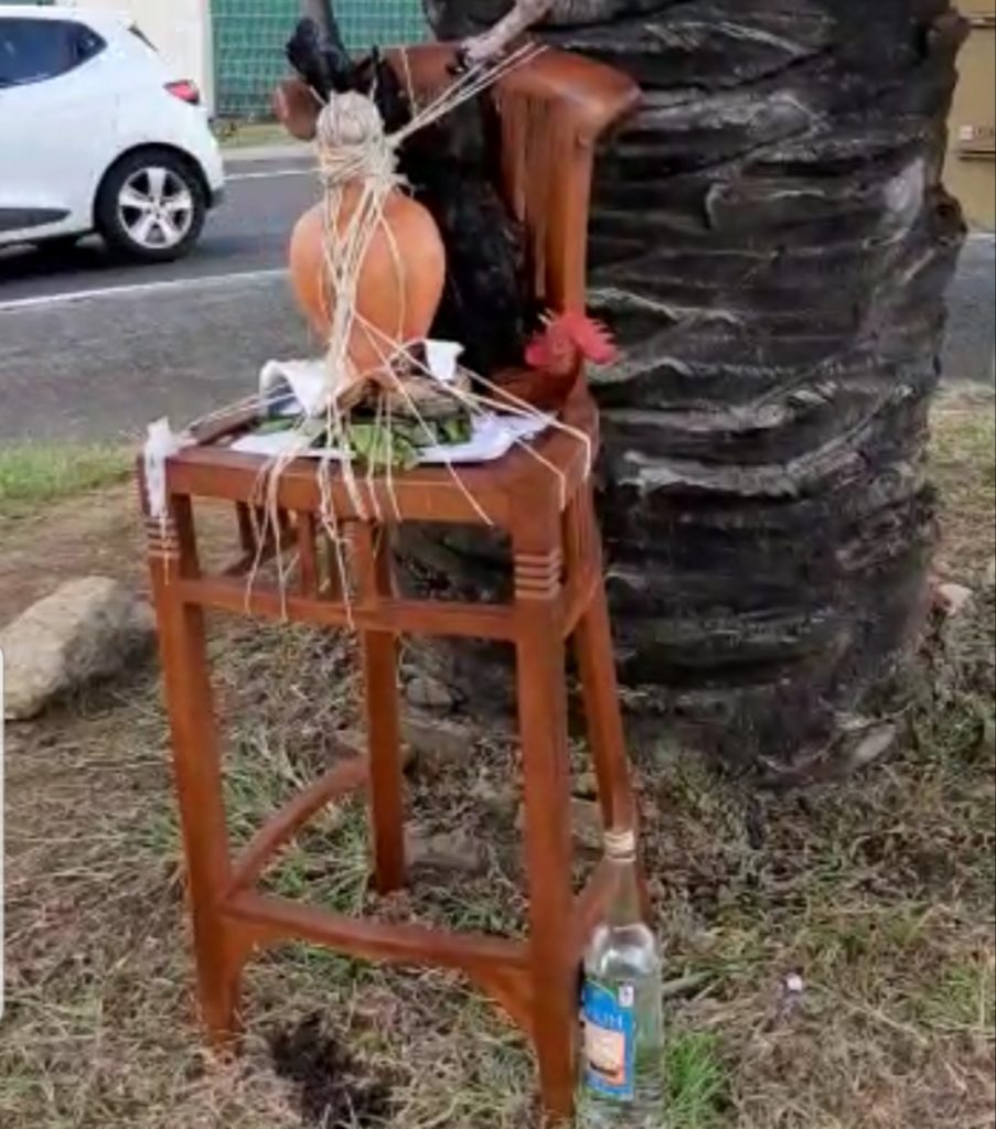 C’est peut-être une première en Martinique avec ce quimbois vivant. Généralement les animaux qui entrent dans cette sphère de sorcellerie sont morts. Là dans le rond-point devant le siège du Groupe Bernard Hayot (GBH), le coq est vivant. En attendant l’intervention de la SPA locale on note que l’île aux fleurs est de plus en plus factice. Antoine Crozat doit être mort de rire.