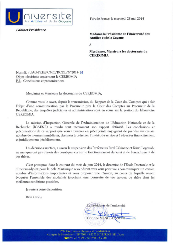 Mme Mencé-Caster, présidente de l’UAG, a répondu aux propos de certaines et certains doctorants inquiets quant aux répercussions de l’affaire CEREGMIA et de la suspension de ses deux principaux dirigeants.