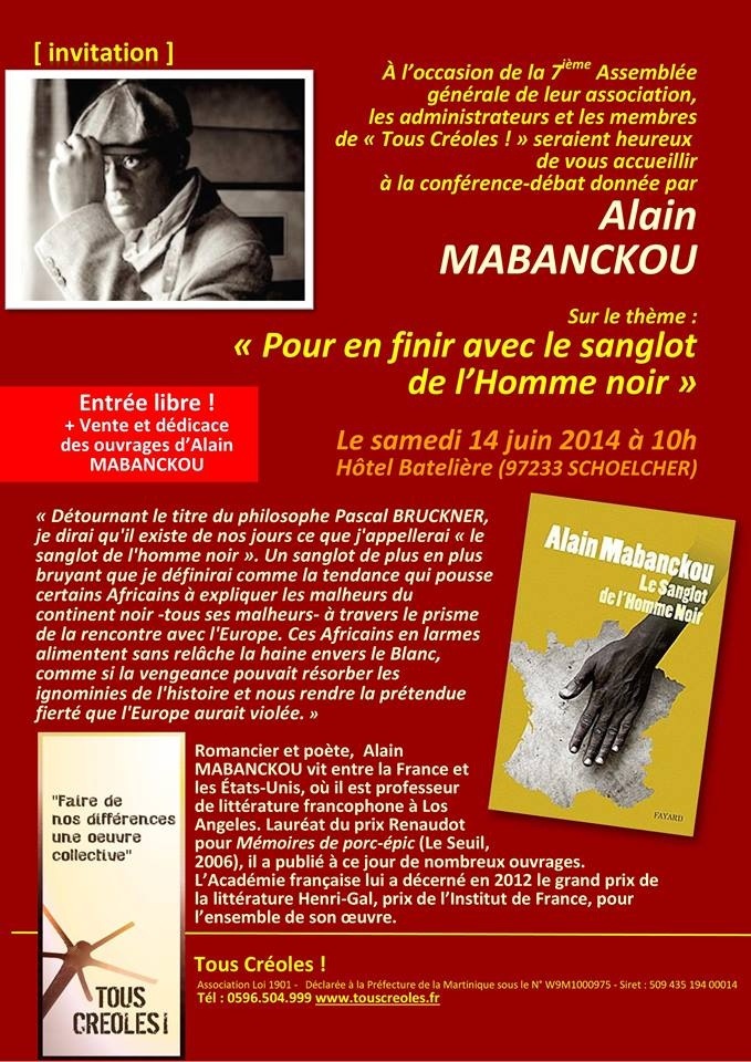 Le 14 juin 2014, l’association Tous Créoles chère à Roger Jaham organise une conférence-débat en #Martinique sur le thème « Pour en finir avec le sanglot de l’Homme noir ». L’invité d’honneur c’est l’écrivain Alain #Mabanckou auteur du livre « Le Sanglot de l’Homme Noir ».